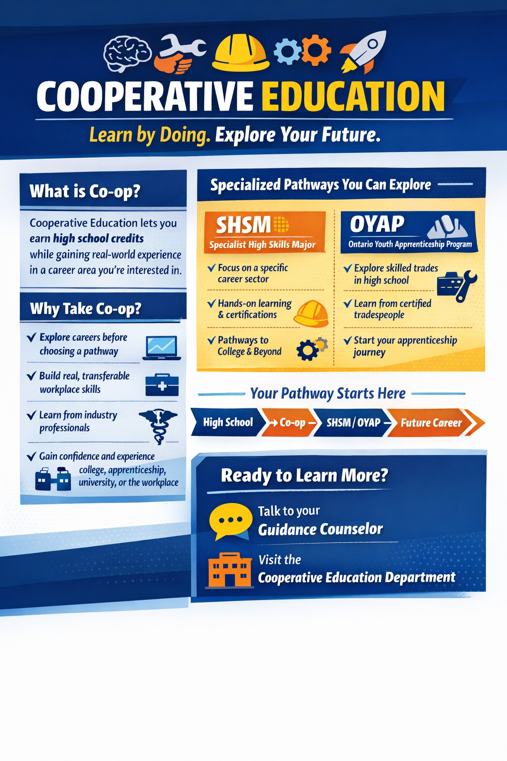 Cooperative Education helps students connect classroom learning to the workplace, build essential employability skills, and make informed decisions about their post-secondary pathways.